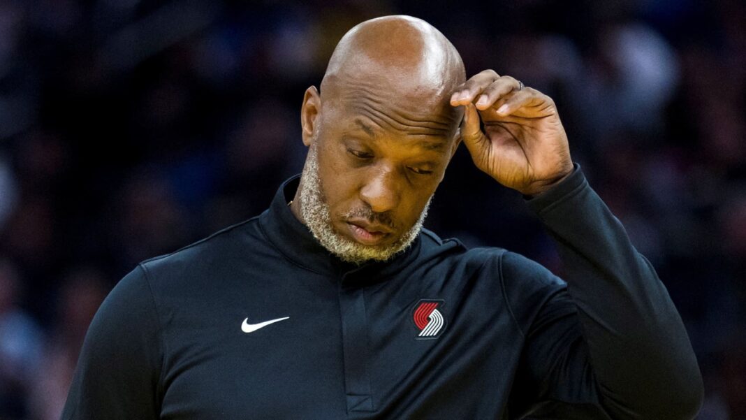Head coach Chauncey Billups of the Portland Trail Blazers reacts during the first quarter of the preseason game against the Golden State Warriors at the Moda Center on October 14, 2025 in Portland, Oregon.