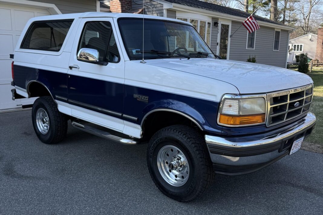 This 1996 Ford Bronco XLT was purchased by the seller from the reported second owner in 2025 and now has 66k miles. It has been refinished in white and blue over Opal Gray cloth and is powered by a 5.0-liter V8 linked with a four-speed automatic transmission and a dual-range transfer case. Equipment includes 15″ forged aluminum wheels, a Pioneer Bluetooth stereo, Kicker speakers, cruise control, air conditioning, and power windows. This Bronco XLT is offered with manufacturer’s literature, service records, a clean Carfax report, and a clean Massachusetts title in the seller’s name.