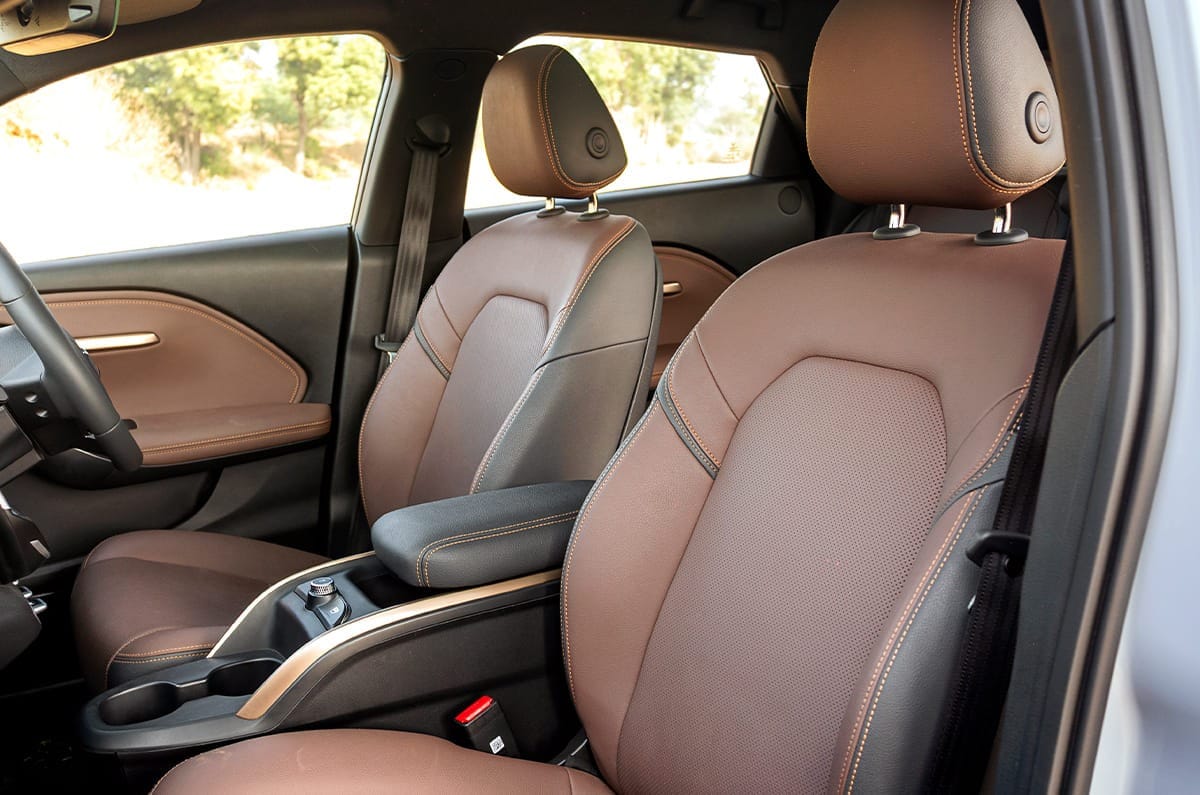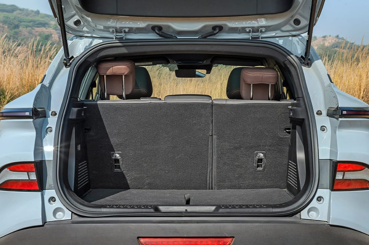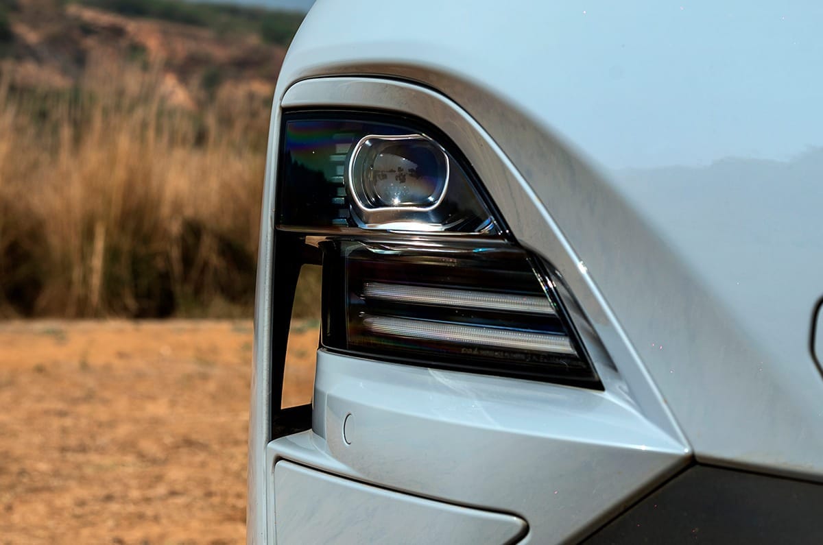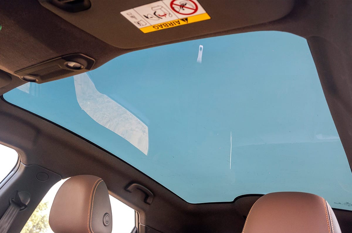 The long wheelbase means rear legroom is surprisingly good, but the high ground clearance means the battery pushes up into the cabin, resulting in a high floor. You sit knees up, the rising window line limits visibility, there are no rear sunshades and taller passengers will find headroom tight. What’s more, while the huge glass roof lets in a lot of light, it also heats up the cabin like a greenhouse. Seat cushioning is good, however, and the vegan leather upholstery feels suitably rich. The 423-litre boot looks good on paper, but feels smaller in practice, and there’s no front storage, and no spare tyre either.