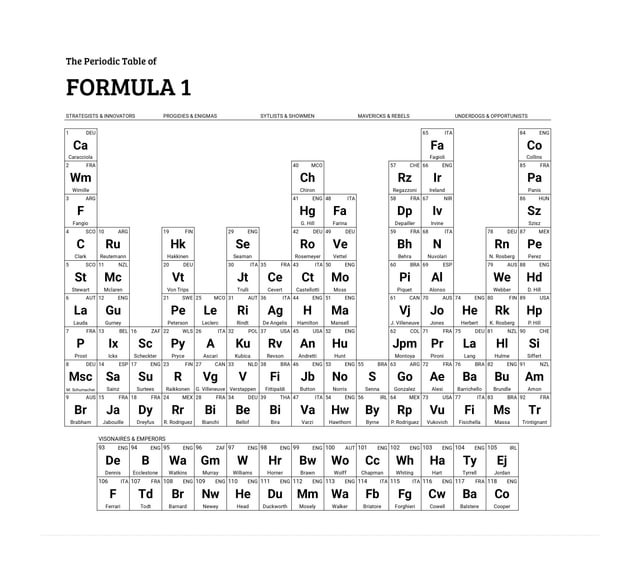 Inspired by the book, The Periodic Table of Cricket, I decided to try and replicate this for Grand Prix Racing. Starting in 1906 I have tried to find the most storied and elemental racing drivers that have impacted the sport and collate them into 5 distinct sections of racing drivers. I also added the most powerful and influential figures in the sport to cover the politics, engineering, entertainment and safety of the sport. This is not an attempt to create a definitive list on the 92 'best' drivers in history, but rather to portray the drivers whose stories explain the fundamentals of the sport. Please query on the placement on certain drivers or other figures or the exclusion of others, and share any stories on these people who have defined the sport submitted by /u/Bob2202192 |