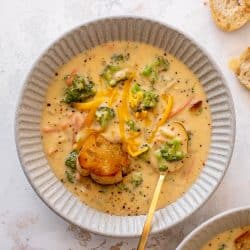 Finally, I like to serve this with some little garlicky toasts. It’s like a giant crouton in the soup and it is SO delicious. Broccoli cheddar soup in a bread bowl is on another level, right? This is like that; the crostini soaks up the soak in the best way and it is just another vehicle to get it into your mouth.Â