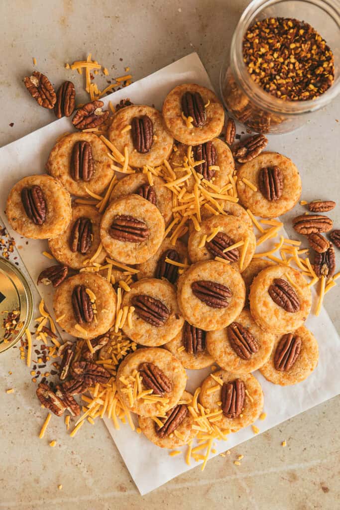 These humble crackers are pure flavor: sharp cheddar, toasted pecans, a little spice, and enough butter to make them practically sigh when they bake. I’m convinced they belong right next to the deviled eggs and sausage-stuffed dates on your Thanksgiving appetizer table and can even be a savory moment in your holiday cookie tins. So good, right? Let’s get to baking.