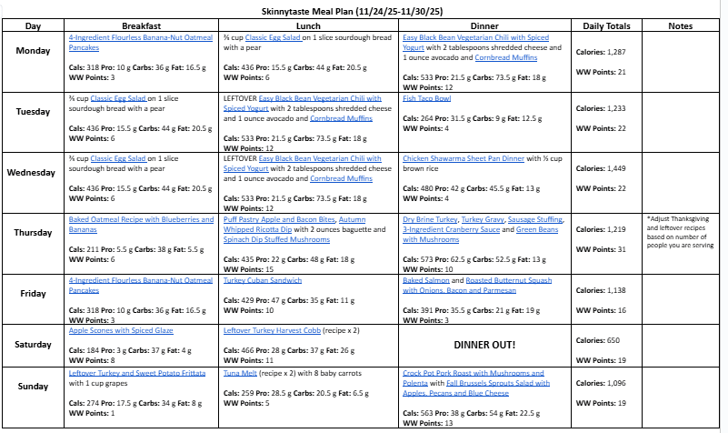 *You need 21 ounces cooked turkey for leftovers on meal plan. Please adjust turkey and all Thanksgiving ingredients and recipes based on number of people you are serving.