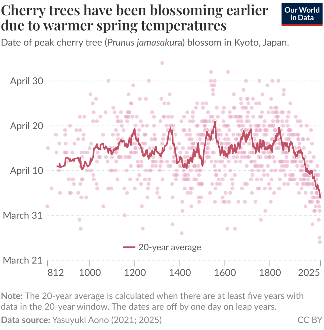 “You can very much see that he planned to continue,” said Tuna Acisu, a data scientist at Our World in Data, an online platform that publishes a chart based on Aono’s cherry tree data. “That made me a little bit emotional.”